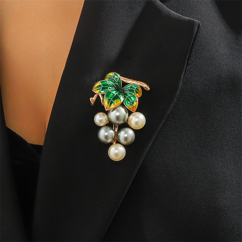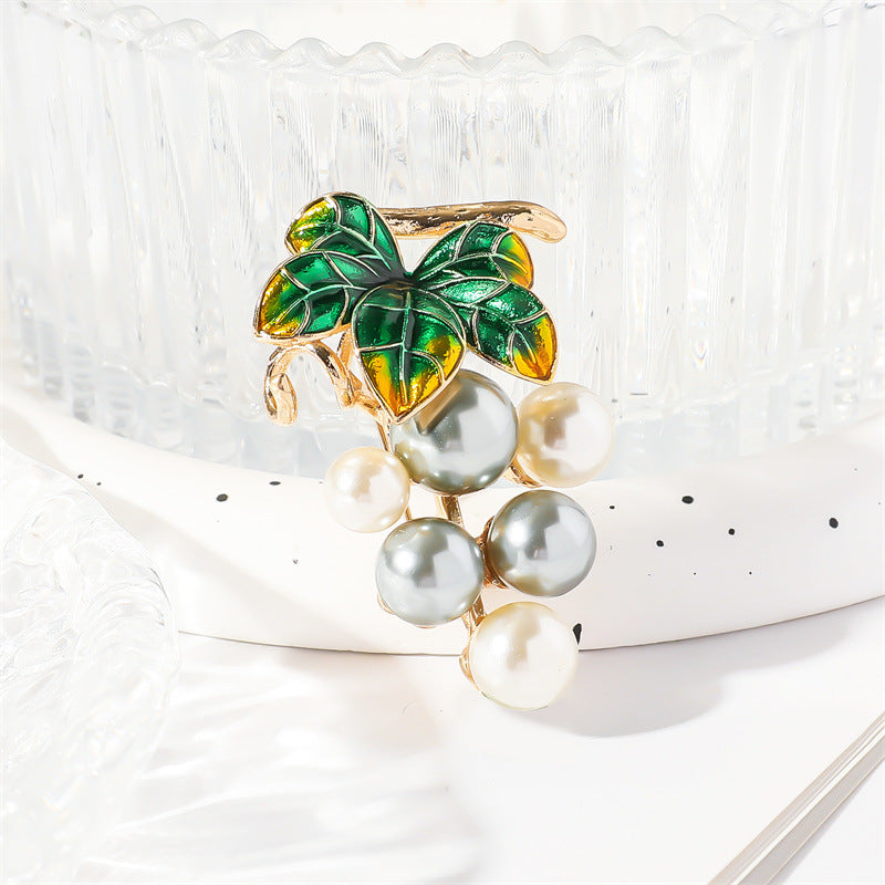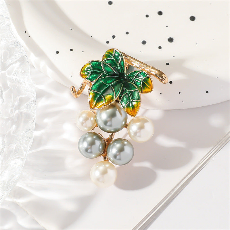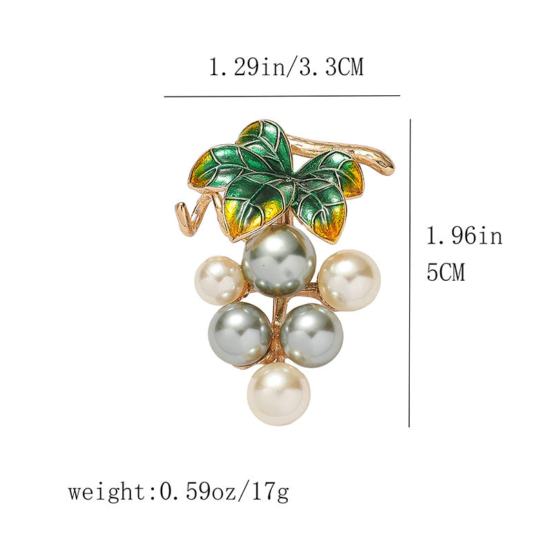FRUIT DESIGN - Brooch featuring cute grape design with faux pearl fruits and green enamel leaves.