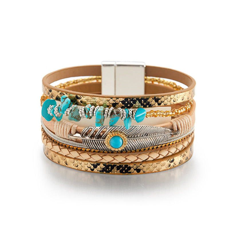 Feather Turquoise Leather Magnetic Bracelets B3779