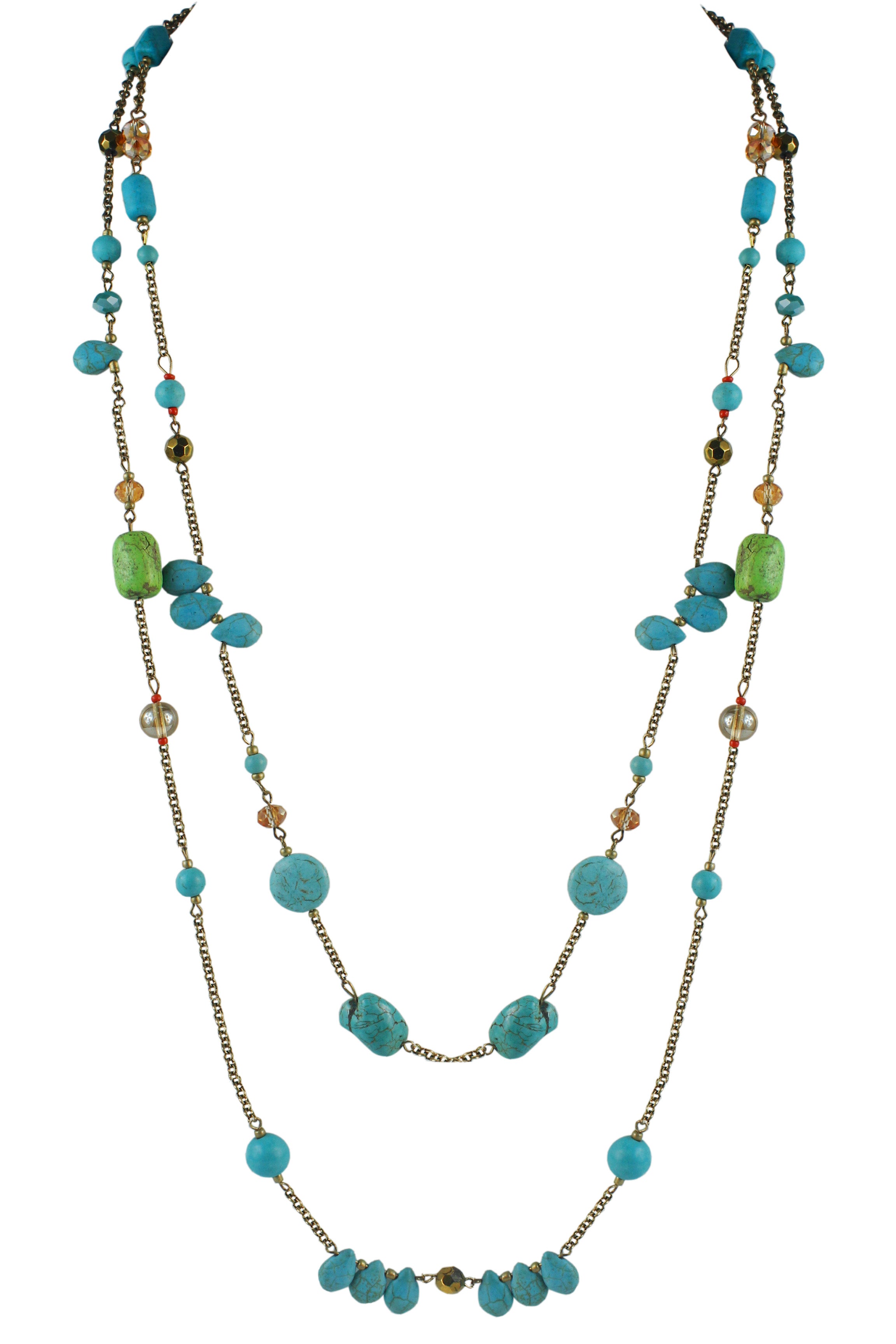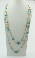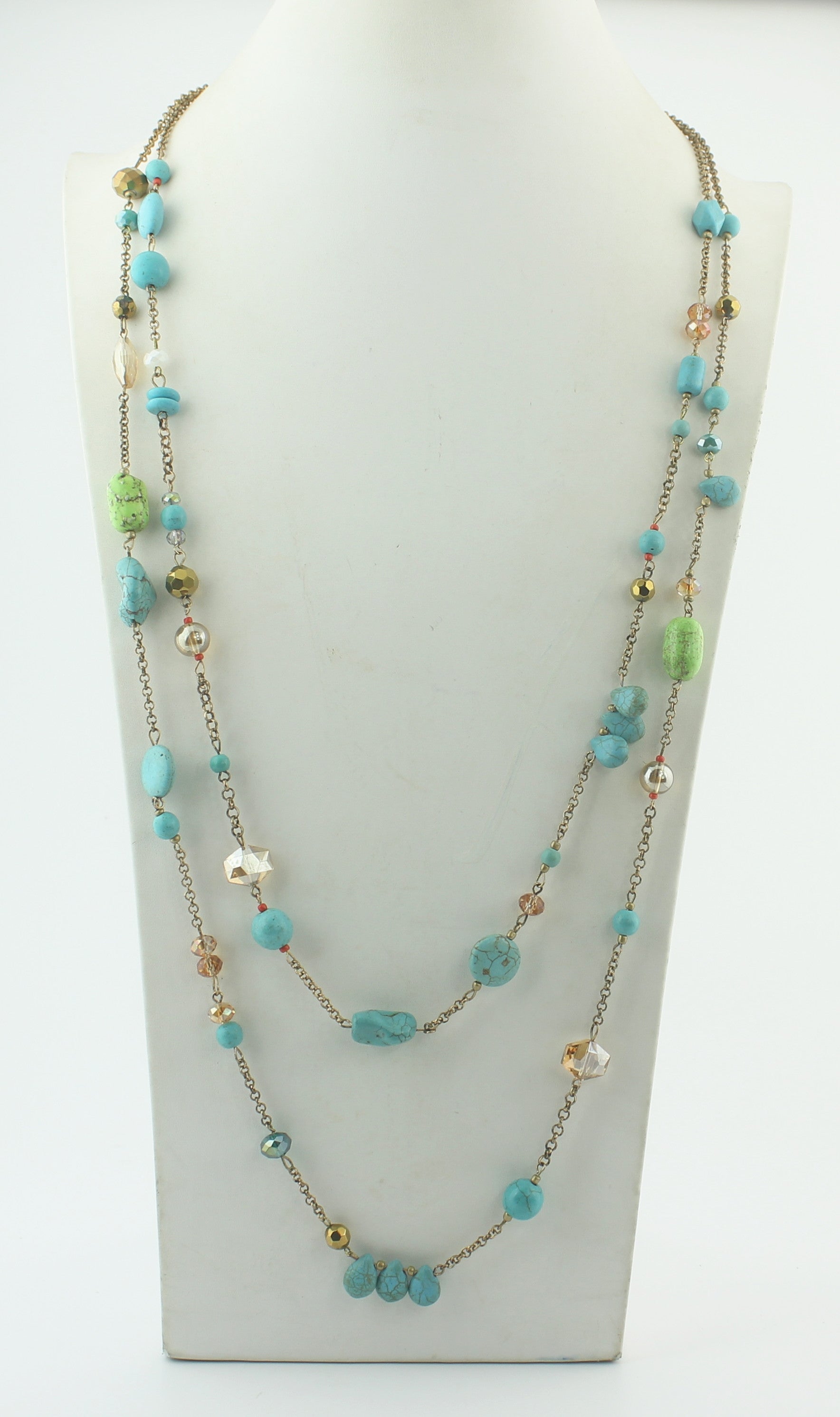 Delicate turquoises of different shapes and small crystal beads are carefully placed along the chain, its unique delicate turquoises caught the light for a dazzling display.