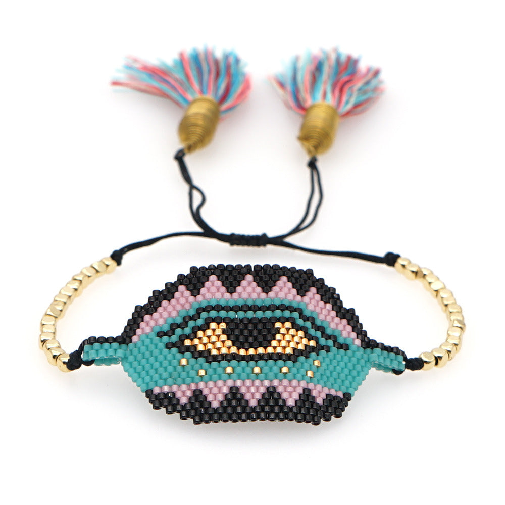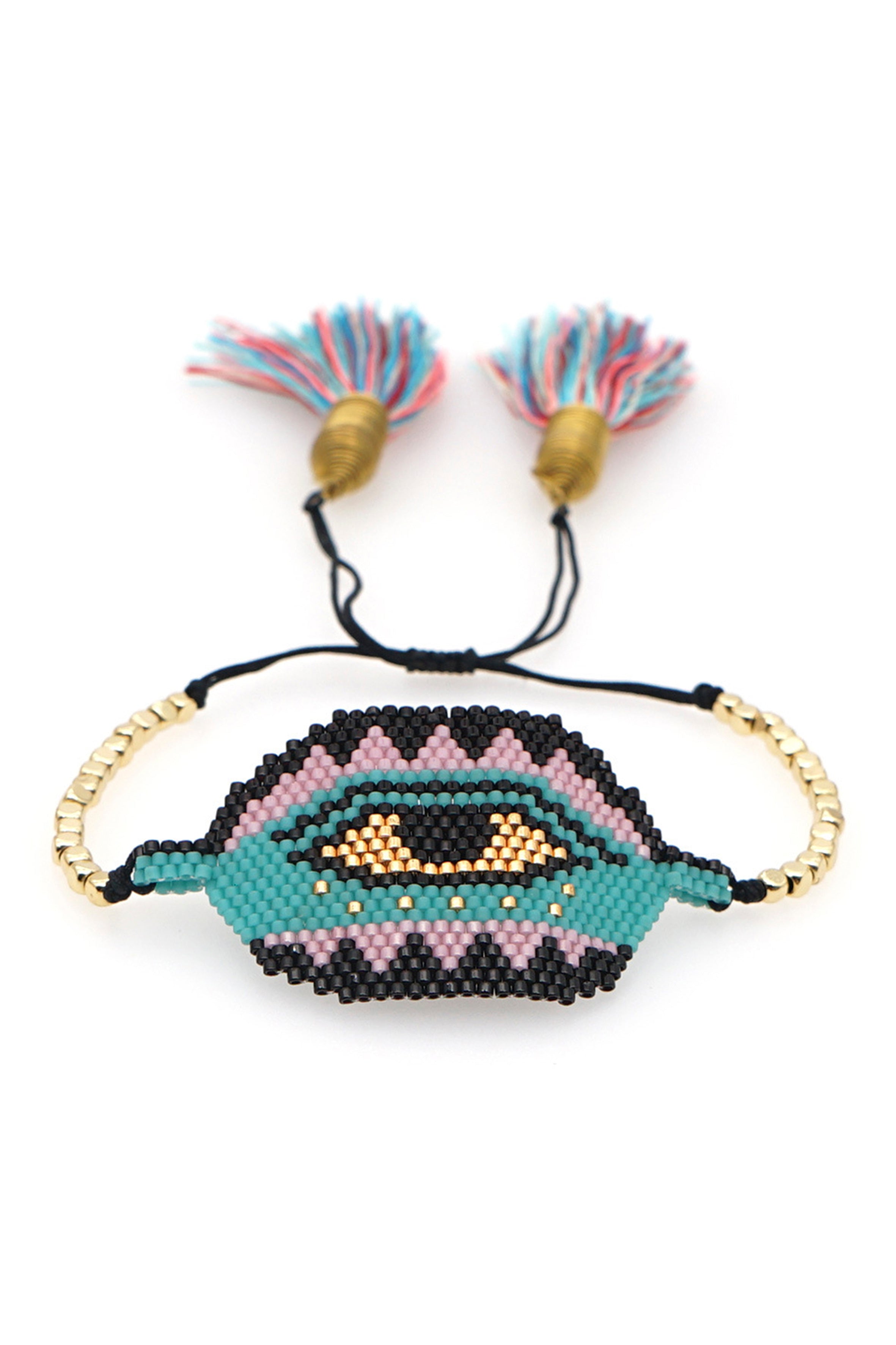 Pulsera trenzada con borlas y cuentas de semillas con efecto ojo malvado B3312