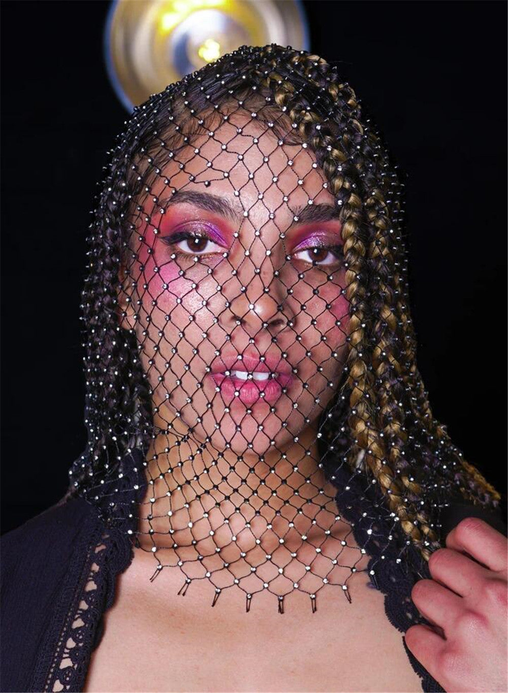 Este producto, la capucha de malla con diamantes de imitación L2842, presenta un material de malla adornado con diamantes de imitación brillantes.