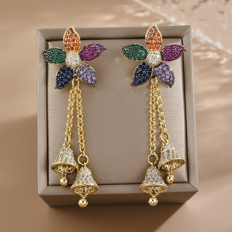 Pendientes de circonita cúbica con borlas y flores en forma de campana E7925