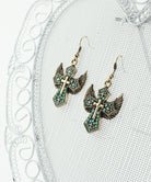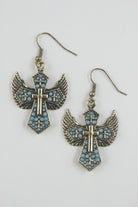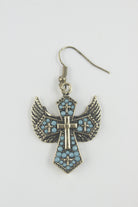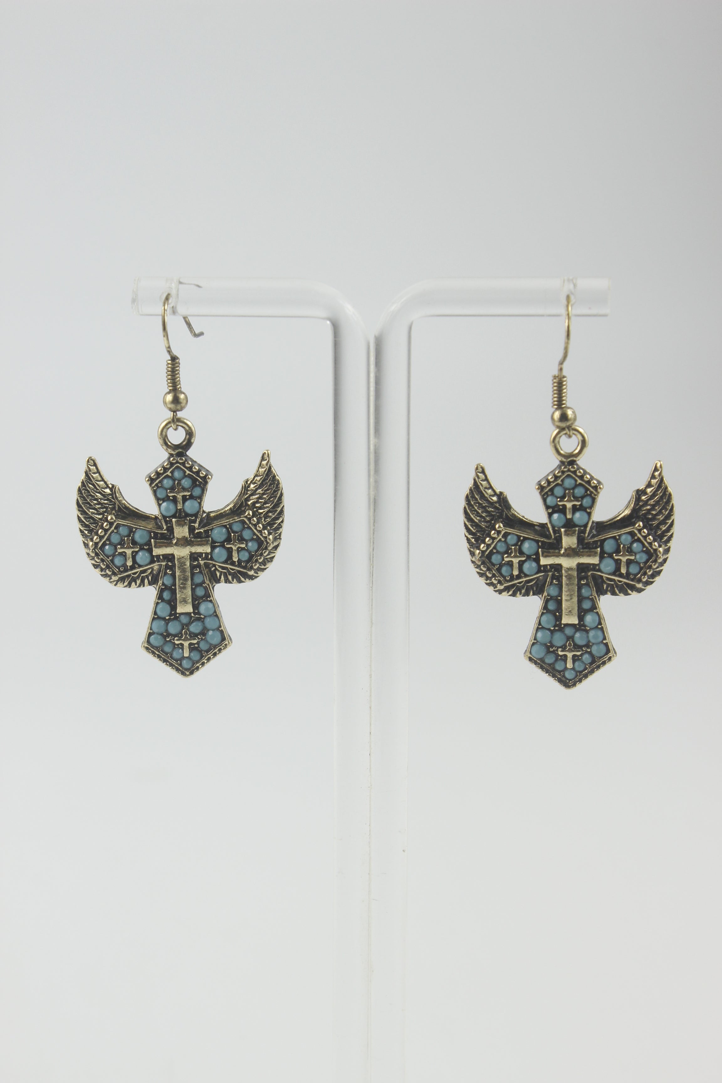 These are classic vintage gothiccross drop earrings copper cross with wings design , inlaid gold plated cross at the center , surrounded by four little gold cross, decorated with blue tiny crystal .