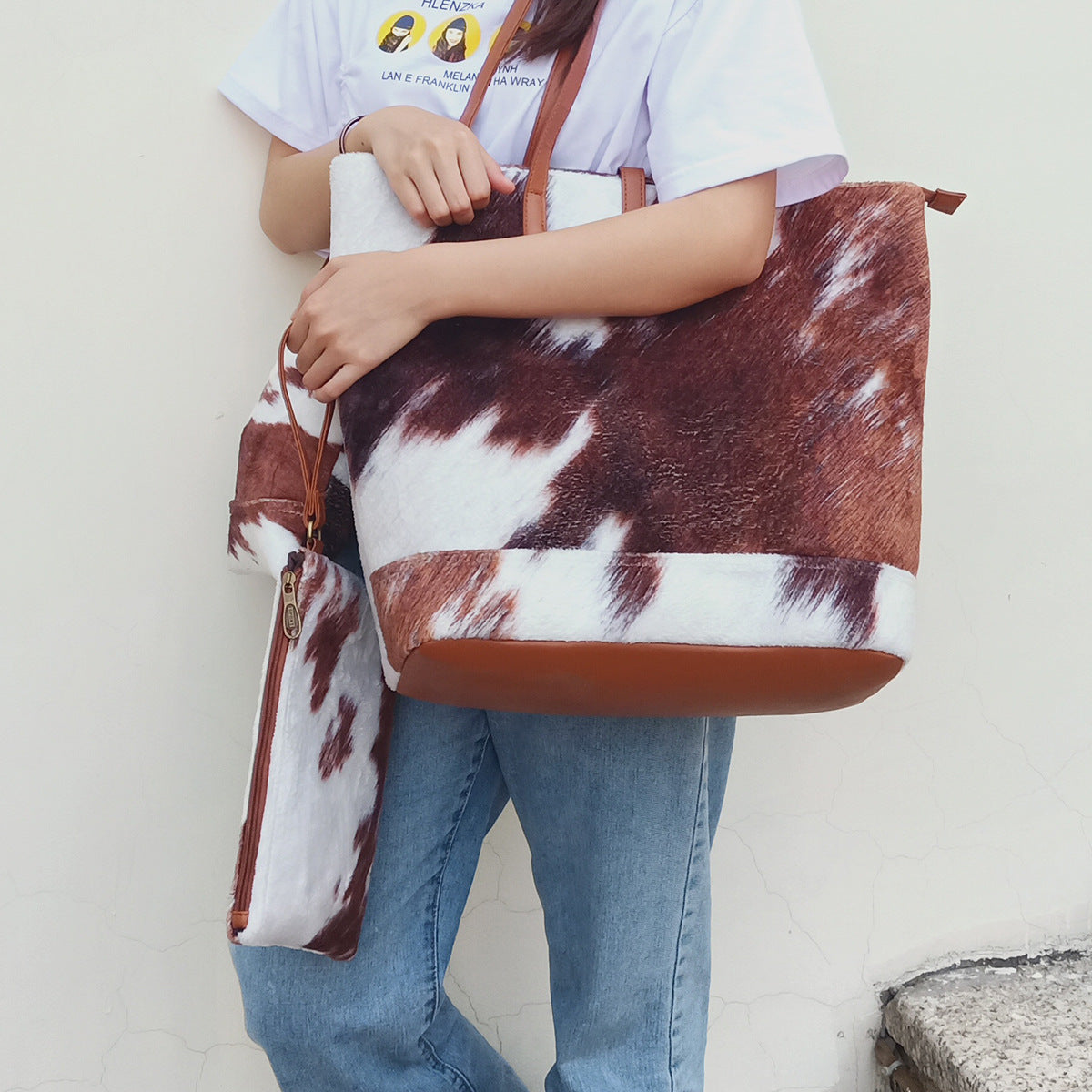 Conjunto de bolso de mano de piel de vaca de peluche HB1660