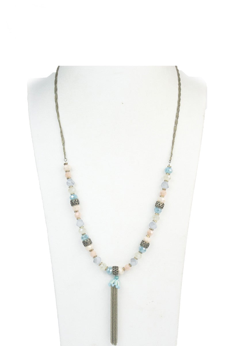 This necklace is made up of crystals of different shapes of light colors. In the middle is the characteristic metal chain tassel pendant, this design gives a simple and fresh visual effect.