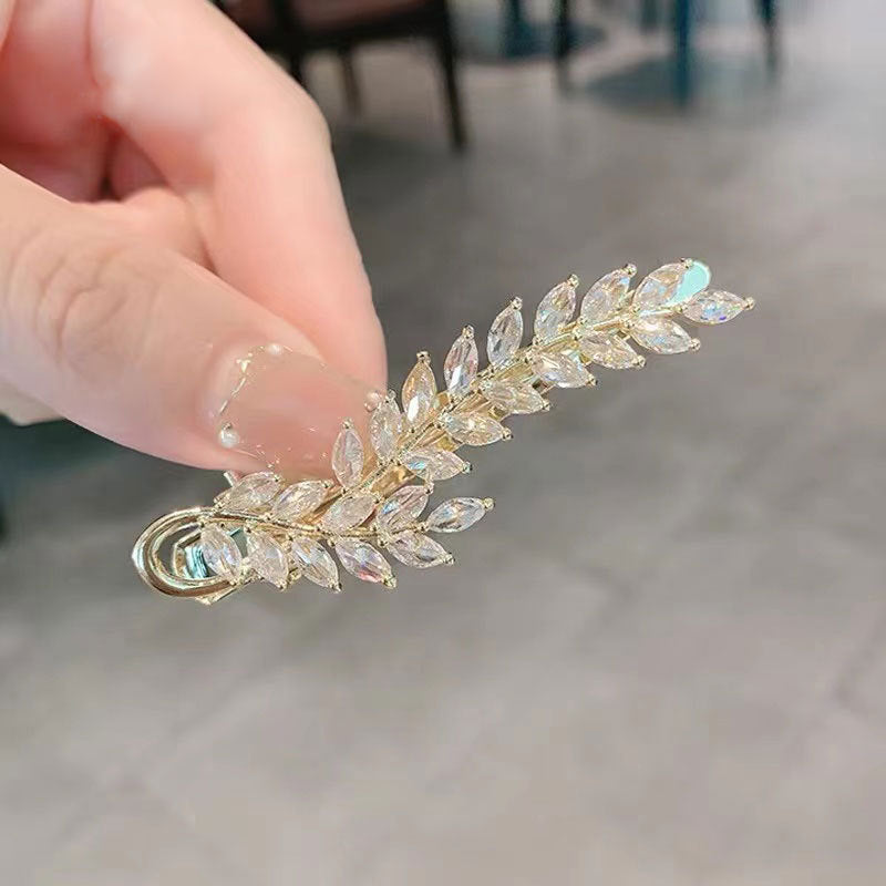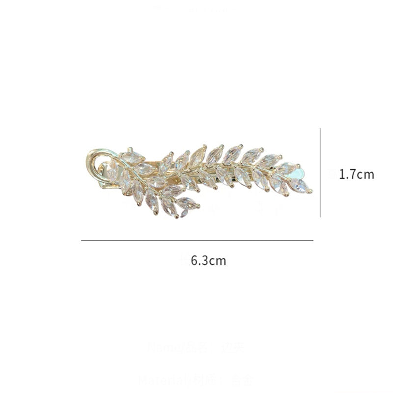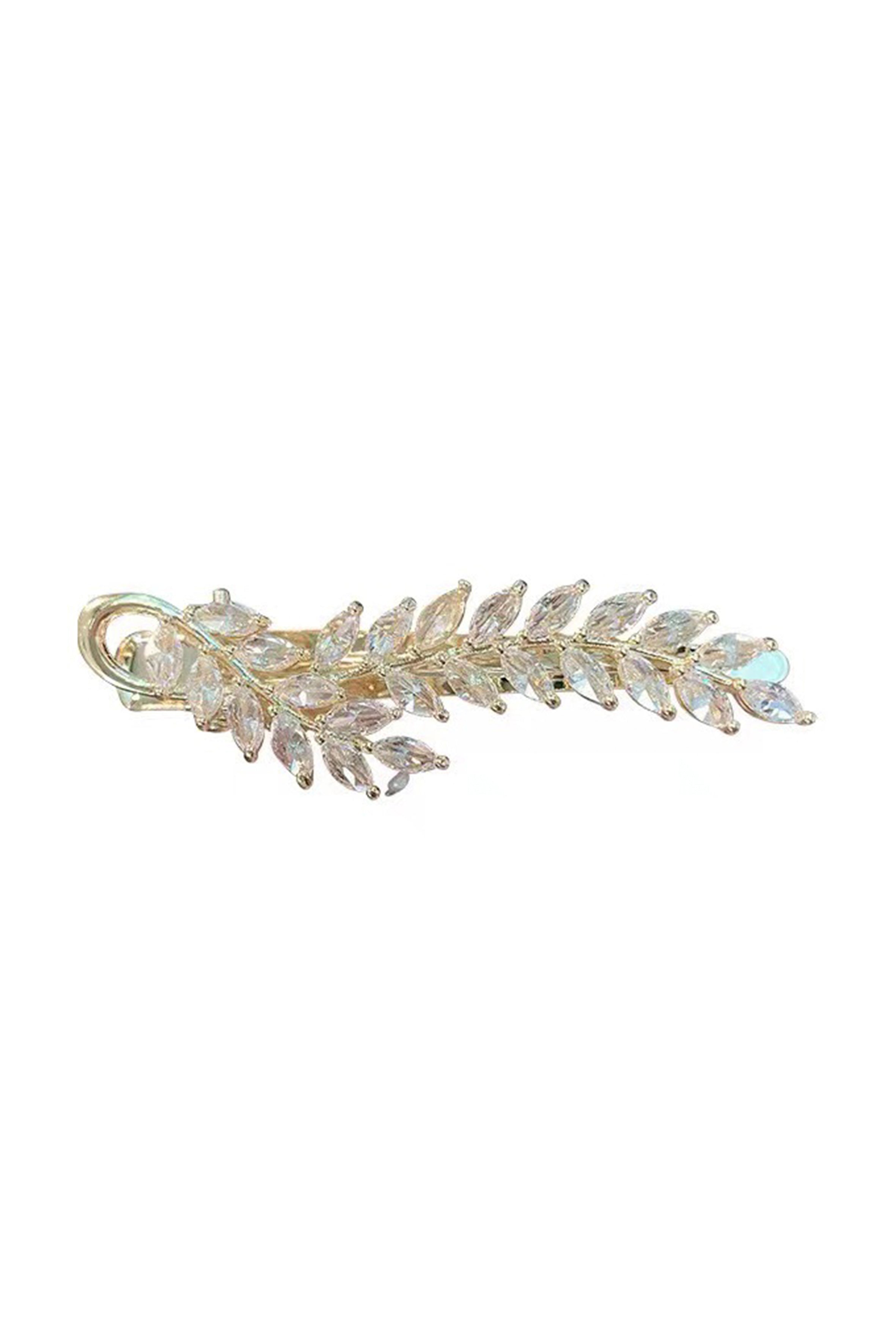 Crafted with precision and style, the Leaf Rhinestone Hair Clip L3613 features an alloy design embellished with sparkling rhinestones, measuring 6.3 * 1.7 cm.